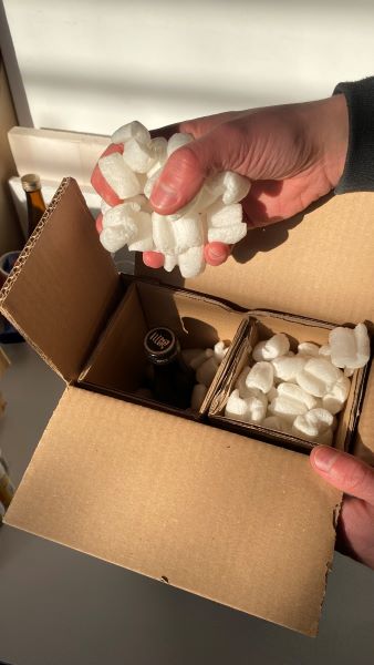 Particules de calage : Les colis sont remplis de particules de calage pour maintenir les bouteilles de manière stable, ajoutant ainsi une protection supplémentaire.